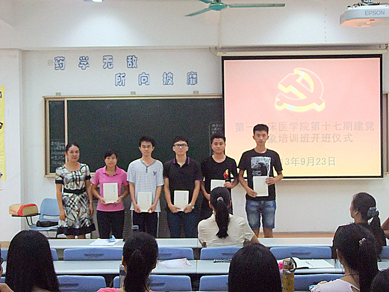2013年9月23日下午4点40分,第一临床医学院第十七期党校开班仪式在我校大学城校区A215顺利开展。出席本期开班仪式的嘉宾有我院党委郭文海副书记,学生工作办公室钟天送主任,团委邱敏副书记,以及学生工作办公室全体老师。