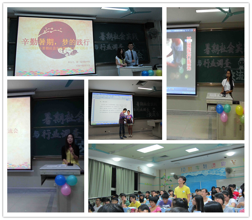 【一院讯】辛勤奉献,逐梦实践。2013年的夏天,注定因为这一群中医学子的努力而不平凡。10月16日晚七点,第一临床医学院2012级中医本科暑期社会实践暨行业调查分享会在综合楼202召开。本次分享会由一院12级中医学1班、2班、实验班主办,三班约200名同学共同参与,旨在分享和展示暑期社会实践和行业调查的成果,促进各班之间的交流学习。年级辅导员池思晓老师出席了本次会议。