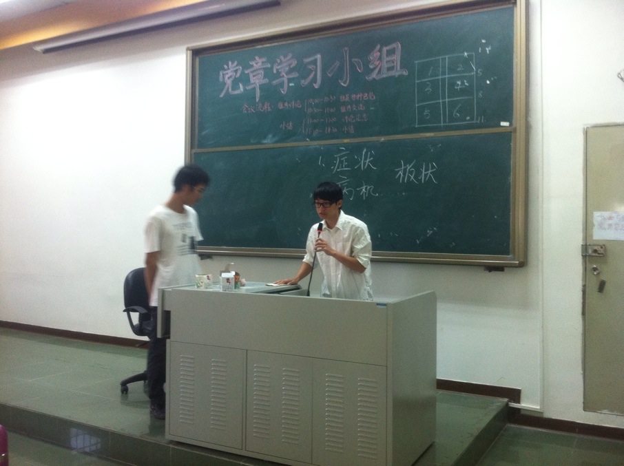 本次讨论大会在上午10:00正式开始。团支书谢恩建在会议初始介绍了主题思想和大会基本流程。会议流程分为三个阶段:首先是组内讨论,六个小组的成员都能各抒己见,从不同的角度讨论了各自对“枫桥经验”的认识和体会;第二个阶段是讨论汇报,六个小组分别派出代表向大家总结组内讨论的结果。第一组从五个方面总结了“枫桥检验”的优势和重大意义,并提出了其中的不足之处;第二组从历史渊源入手,总结了“枫桥经验”带来的成就,并积极支持“枫桥经验”的实行;第三组重点总结了“枫桥经验”的不足之处;第四组强调“枫桥检验”的推广应结合当地特色;第五组侧重于强调“枫桥经验”实行的条件;第六组就“枫桥经验”实行的具体方法作出了讨论和引申。最后团支书总结了大会,党章学习小组第一次讨论大会结束。