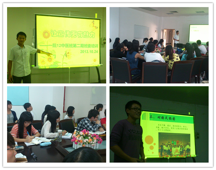 通讯稿和班级照片是对内记录班级点滴,对外展现班级形象的重要工具,所以写好通讯稿,拍好照片,也是班委们义不容辞的责任。据悉,12级中医三个班的班委内训活动是由池老师提出,三个班班委轮流负责的内部经验交流会,旨在给年级班委们提供一个自我培训自我学习的平台,促进不同职位班委之间工作经验的交流,以期塑造全能型班委。本次培训是此类活动的第二期,第一期培训主题为“沟通的艺术”。
