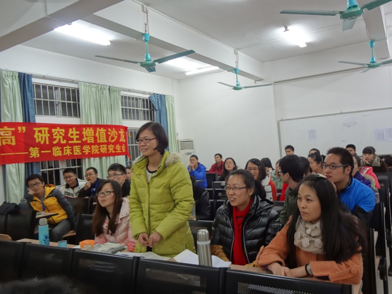 2013年12月15日晚在综教楼305室举办的第一临床医学院研究生“学术增值沙龙”上由博士研究生张升和王创畅,与研究生们共同分享他们的临床及科研成功之道,共同解决上述问题。