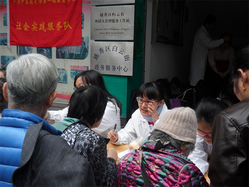 三月春风的温和透着别样的亲切,呈现出生机勃勃的美丽景象。白云街社会服务保障中心附近是个菜市场,恰逢周末,同学们布置好场地做好准备后,白云街社区服务中心瞬间热闹起来。这次义诊我们一共分为五组。分别是测血压组,艾灸组,拔火罐组,宣传组,按摩推拿组。今年我们是大四了,转眼就要实习了,同学们无论是专业理论水平上还是实际操作能力都比以往更上一层楼,和市民的沟通能力也大大提高。也许是因为大四下学期专业班分科的原因,同学们回答市民所提出的问题也颇具有专业性。例如有阿姨咨询关于停经之后出现的内分泌失调的问题,妇科班的同学回答的答案让人十分满意。按摩推拿组的同学不会像以往那样只会按阿是穴,现在他们会根据每个人体质的不同,疼痛部位的不同而选择不同穴位按摩推拿,叔叔阿姨对我们的表现都赞不绝口。艾灸组的同学也把课堂所学的知识运用到义诊来,不只是单一的回旋灸,还增添了雀啄灸,隔姜灸,隔盐灸等。宣传组的同学除了宣传中医中药知识以外还跟叔叔阿姨聊家常,教教他们养生的诀窍,告诫他们要注意情志的舒畅,很多疾病都和情志相关。很多市民都想知道我们下次是什么时候再来义诊,而且他们很希望我们每周来一次。他们的热情让我们觉得再苦再累也是值得的。