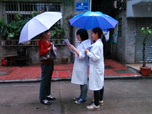 2014年3月29日早上八点许,同学们来到越秀区北京路雅荷塘家庭服务中心附近,通过派发传单、口罩和健康知识问答的方式向该社区的居民普及防御禽流感的相关知识。尽管天公不作美,但是同学们依然冒着小雨向路过的社区居民普及关于“正确认识和防御H7N9型禽流感”的知识,并传递“飞沫是传播流感病毒的元凶,戴口罩能防御飞沫传播甲流”理念,同时赠予居民口罩。不少接到口罩的居民向同学们表达感谢,并表示对流感疾病的认识又进了一步。此外,因临近一附院50周年院庆,志愿者们还向居民们宣传、介绍我校第一附属医院,部分居民向一附院献上了贺词和祝福语。
