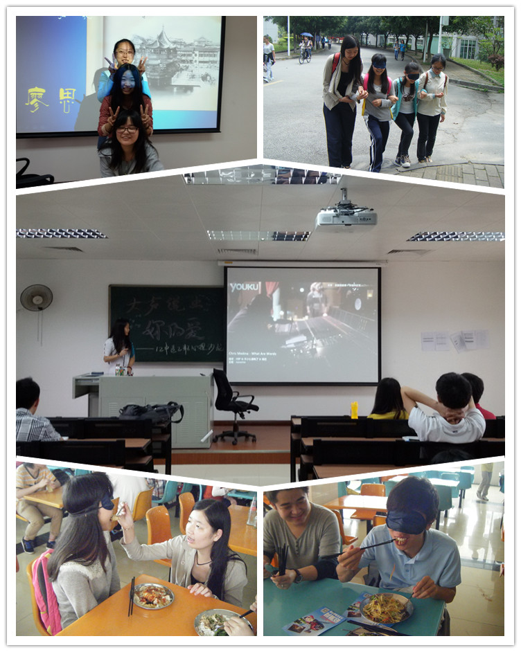 现在的社会关系越来越复杂,小的时候妈妈也教我们不要随便相信别人。而这个活动恰恰是让同学们体会信任的力量,它能促进沟通,增进同学们之间的感情。首先随机选出三人组成一个团队,其中一个人需要佩戴眼罩,另外两个人扮演导盲员的角色,带领佩戴眼罩的同学从教学楼走到宿舍,其中包括吃饭、冲卡和买东西等日常活动。一开始有的同学还不是十分相信周围的同学,前进的速度较慢,自己慢慢的摸索前进的道路,但经过沟通之后,默契度也慢慢升高,前进的也变得顺利了。导盲的同学也要全神贯注的关注周围环境的变化,才能避免戴眼罩的同学出现前进障碍。