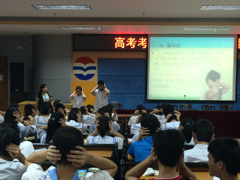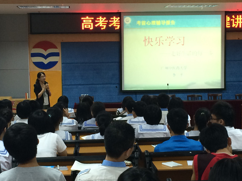 晚上8时,宣讲团刚到湛江便前往湛江市第二中学,为400余名高三考生开展“高考考生心理及饮食保健知识”讲座。讲座中,武夏林老师的考前中医饮食保健讲座,结合中医药的优势和特色,为考生推荐了祛湿健脾解困汤、疏肝解郁汤等多种中药饮食方,并介绍了头面部保健按摩和“足三里”、“合谷”等保健穴位的按摩手法,让考生受益匪浅。而李平老师讲授的主题为 “快乐学习——走好生活的每一步”,她以心理学经典故事及图片引入主题,分析了过度焦虑的原因和表现、焦虑对考试的影响、并教给大家积极暗示法、认知改变法等具体方法,以预防和应对考试焦虑情绪。这对于考生如何缓解考前压力,以积极心态面对高考起了很好作用。
