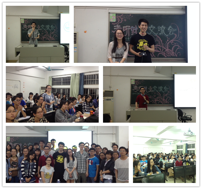交流会邀请了4名2015届的应届毕业生为同学们分享经验畅谈心得,主讲人包括已考取了中南大学湘雅医院研究生的2010级中西医专业的胡如龙师兄,、考取了广中医一附院泌尿外科研究生的2010级中医学专业的陈炽伟师兄、现为广州医药有限公司销售实习生的2010级中西医的贺立师兄,以及现为国药控股广州有限公司实习生的2010级中西医的孙琪师姐。