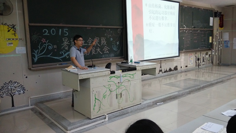 6月27日上午9时许,我院2015年暑期社会实践动员大会暨社会实践知识技能培训在大学城综合楼101课室举行,参加本次大会的嘉宾有院党委副书记严晋老师,院学工办主任钟天送老师,院学生分团委书记邱敏老师,以及学工办的各位老师。