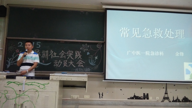 动员大会在严晋副书记的祝福和鼓励中结束了。紧接着附院急诊科余锋老师开始了社会实践活动知识技能培训第一课。余老师给大家介绍了各种危重症的诊断和处理,其中重点讲解了有起死回生术之称的心肺复苏术。结合在教学过程中学生容易出现的错误,余老师的讲解让同学们受益匪浅。
