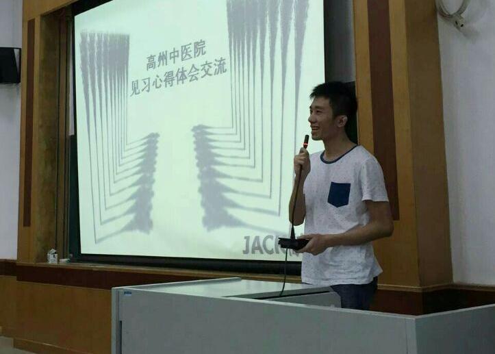 来自高州市中医院、台山市中医院、湛江市第一中医院、祈福医院、东莞康华医院的同学代表分享教学实习的工作经验、生活见闻。招文华等五位同学汇报了他们采访当地名老中医的经历。