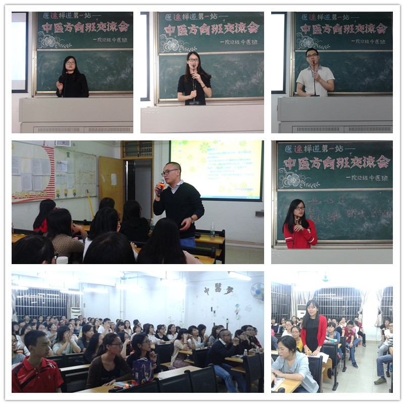 【一院讯】现代医学体系分科明确,专业专精,这是目前医学的发展模式,即便是中医院校也不例外,如此一来,如何选择一个合适自己的专业方向就成了一道每一位医学生都必须慎重作答的选择题。为帮助大四的中医学子更好地进行专业方向的选择,在池思晓老师的指导下,由一院2012级中医班全体班委策划主办的“医途择道第一站——中医方向班交流会”于10月13日晚上7点在新课室楼102正式举行。