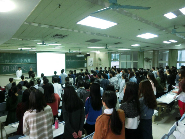 由于本学期没有自习课,我们的活动安排在下午5:40开始。在主持人詹晨光同学的带领下,全班同学精神饱满,一起大声朗诵大学精神“崇德远志,和衷有容,汲古求新,笃学精业”以及校训“厚德、博学、精诚、济世”,声音铿锵有力,雄浑洪亮,响彻教室各个角落,大家的声音里都带着无法压抑的自豪感。