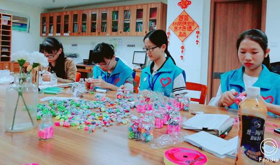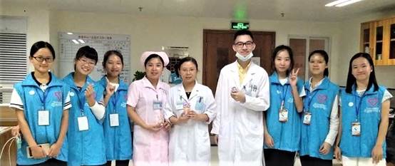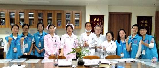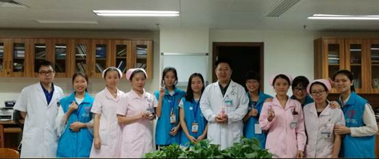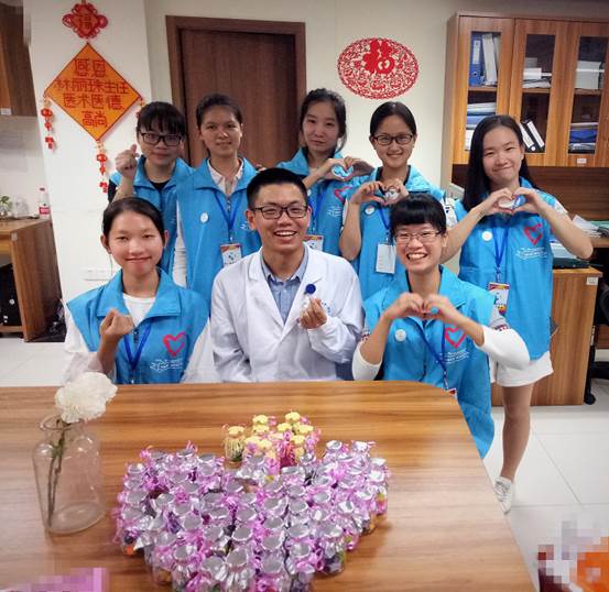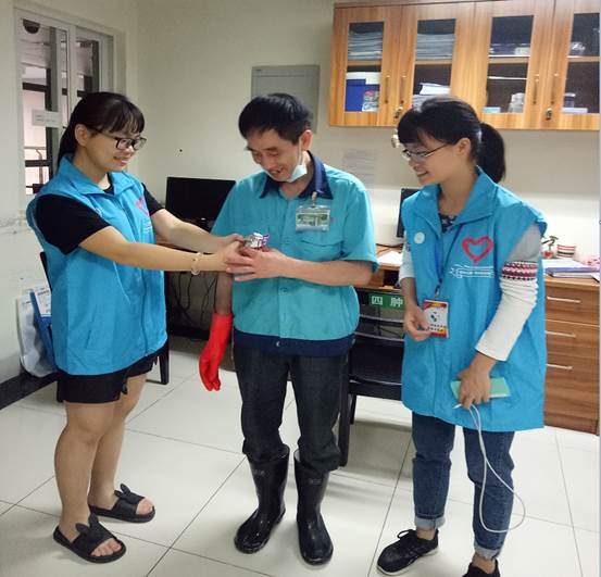 今天对我们来说是个既特殊又美好的日子——重阳节。这是我们团队第三次来到四肿科室,这次带领我们的是罗智杰师兄。对于罗师兄给我们的第一印象就是像我们的师弟(好年轻),而且比女孩子还要细心,还特别会关心周边的人,无论是对我们还是病人都特别有耐心——是个很少得的暖男。对于这个节日,我们队继承上届及上上届师兄师姐的传统——制作礼物送给病人跟科室的医生和护士姐姐,愿病人早日康复,愿医护人员一生平安。我们各自分工合作,有的去四个科室收集瓶子,有的折星星,有的剪纸,有的系花带,有的弄AB胶透明花心……经过早上和下午的共同努力,一个个精致的瓶子里都装着我们满满的心意送到了病人和医护人员的手中,看到他们的笑容,我觉得一切都是值得的……一天说长不长,说短不短,一天工作下来,虽说有些累,可是却感到很充实很开心……(何清清)