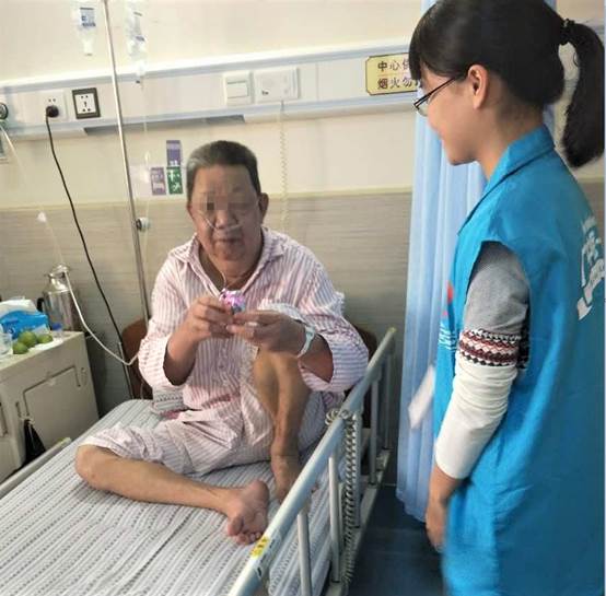 患者们收到礼物后很开心。记得我们刚刚把载满礼物的车子推进病房时,患者们都探过头来看,问我们这是什么。我们笑着把礼物给他们后,整个病房都变得欢乐起来了。这让我深刻地感受到了作为志愿者的乐趣:在带给别人快乐的同时自己也很快乐。我想,我们就如同一针强心剂,带给患者心灵上的慰藉,又如一束阳光,照亮他们的心房,也许这就是人文关怀的魅力吧(林书馨)