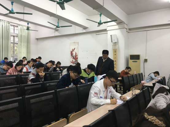 当天下午,同学们在综教楼102课室进行本学期最后一门考试。陈文锋书记来到考场,和主考胡小英老师亲切握手问候后,认真巡视了整个考场,对井然的考场秩序和优良的考风表示了肯定。