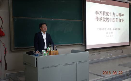 冼院长从十九大国家重视发展中医药引入,在给学生讲授的《学习贯彻十九大精神,传承发展中医药事业》专题思政课中,分别从四个方面阐发中医药的发展历程,向学生们讲述了中医药发展的不平之路,习总书记关于发展中医药的重要指示,并着重讲述了国医大师邓铁涛对中医药发展的突出贡献,以及当前中医药事业发展的美好前景。