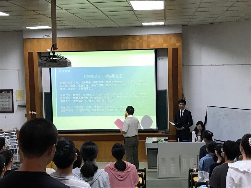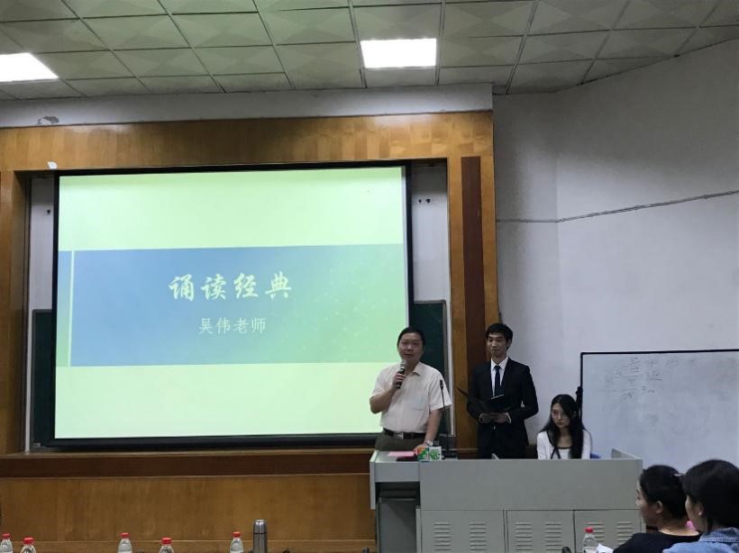 晨读经典活动一开始一周有余,为此一附院大内科兼内科教研室主任吴伟教授带来了精彩发言并做晨读动员。吴教授回忆了自己80年代的艰辛学医路,也提及当前疫情防控,做好防护措施很有必要。吴教授认为学生参与第二课堂是很重要的,要多参与学术类活动。如何让广中医的每一位学子成为优秀的中医药人才,发展中医药事业,吴教授认为多开展学术月这类的学术活动有利于学生成长进步。吴教授引用邓老的“四大经典是根,各家学说是本,临床疗效是中医的生命线,与新的科学技术革命相结合,是自主创新的大方向”来鼓励同学们自主创新。他指出,创新的基础首先是传承,缺乏牢固的基础是很难进行创新的,他也强调活跃的学术活动有利于培养优秀人才。最后他寄语学子,希望在座同学努力争当学术月活动的积极分子和核心力量。最后就是最经典的经典晨读动员环节,吴教授在带读的同时也为大家讲解经文含义,同学们在吴教授的带领下进行诵读,铿锵有力的语句在教室久久回响。