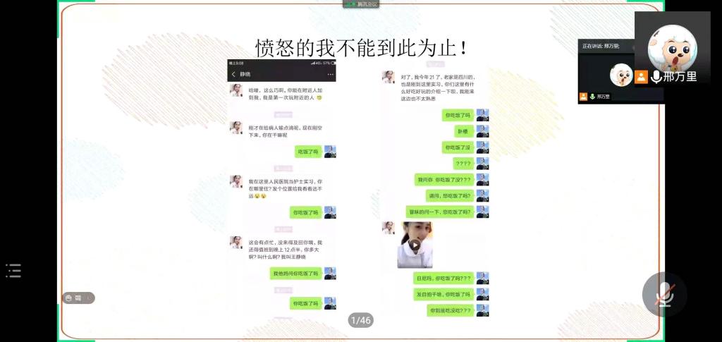 本次会议由17级中西医邢万里同学主持,在简要的介绍后便开门见山,直指第一种诈骗手法——伪造网络身份与受害人微信聊天。骗子首先通过附近的人或微信号添加受害人,然后与受害人开始聊天拉家常,当关系熟络后便开始行骗。但是,事实上,许多骗子都不是亲自与受害人聊天,而是通过机器人,机器人只会发送特定的文字、照片及视频。只要稍加辨别,便能迅速识明骗局,从而进行规避。