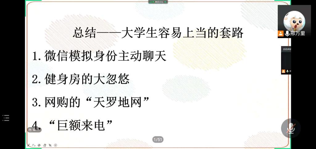 【一院讯】2020年11月8日星期日下午四点,广州中医药大学大学第一临床医学院武夏林老师所带领的五个班级参加了“诈骗——有迹可循”的线上防诈骗主题会议。本次会议旨在通过专题学习,让同学们对冒充公检法、中奖、培训诈骗等虚假事件具备一定的鉴别能力,避开跳进校园贷、套路贷、刷单贷等陷阱,遇事冷静分析、积极采取措施规避风险,掌握紧急情况下自救和互救的知识。