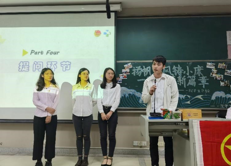 会议开始前,现场播放了2020年我院“三下乡”队伍风采视频,让同学们对“三下乡”活动有了初步的了解。接着,会议正式开始。首先,我院全国优秀社会实践团队福铃队队伍代表简心悦上台发言,向同学们介绍了福铃队的队伍建设情况和特色活动,并分享该队伍多次获得省级荣誉和国家级荣誉的组织经验与管理心得。随后思榕队代表林海钦上台分享下乡趣事、建队初衷和队伍历程等,两位队伍代表的分享进一步清晰了同学们对三下乡的认识,也激发了他们极大的热情。此外,会议现场我们还设置了趣味游戏环节,包括填诗句、有奖知识问答,现场气氛热烈。随后,一院学生分团委实践部副部长张子清对我院暑期社会实践系列活动的概况和参加准备等方面进行讲解,带领同学们更深入地了解暑期社会实践系列活动。接着,进入问答环节,现场观众就队伍服务范围与下乡出行等方面提出问题,思榕队代表、福铃队代表和实践部负责人均对提问进行了耐心的解答,解除了同学们的疑惑。问答环节结束后,与会同学将参加本次宣讲会的感想、对三下乡的期待与建议写在便利贴上,工作人员收取并进行整理,为后续工作更好的开展收集相关的建议。最后,与会人员合影留念,为本次宣讲会画上了圆满的句号。