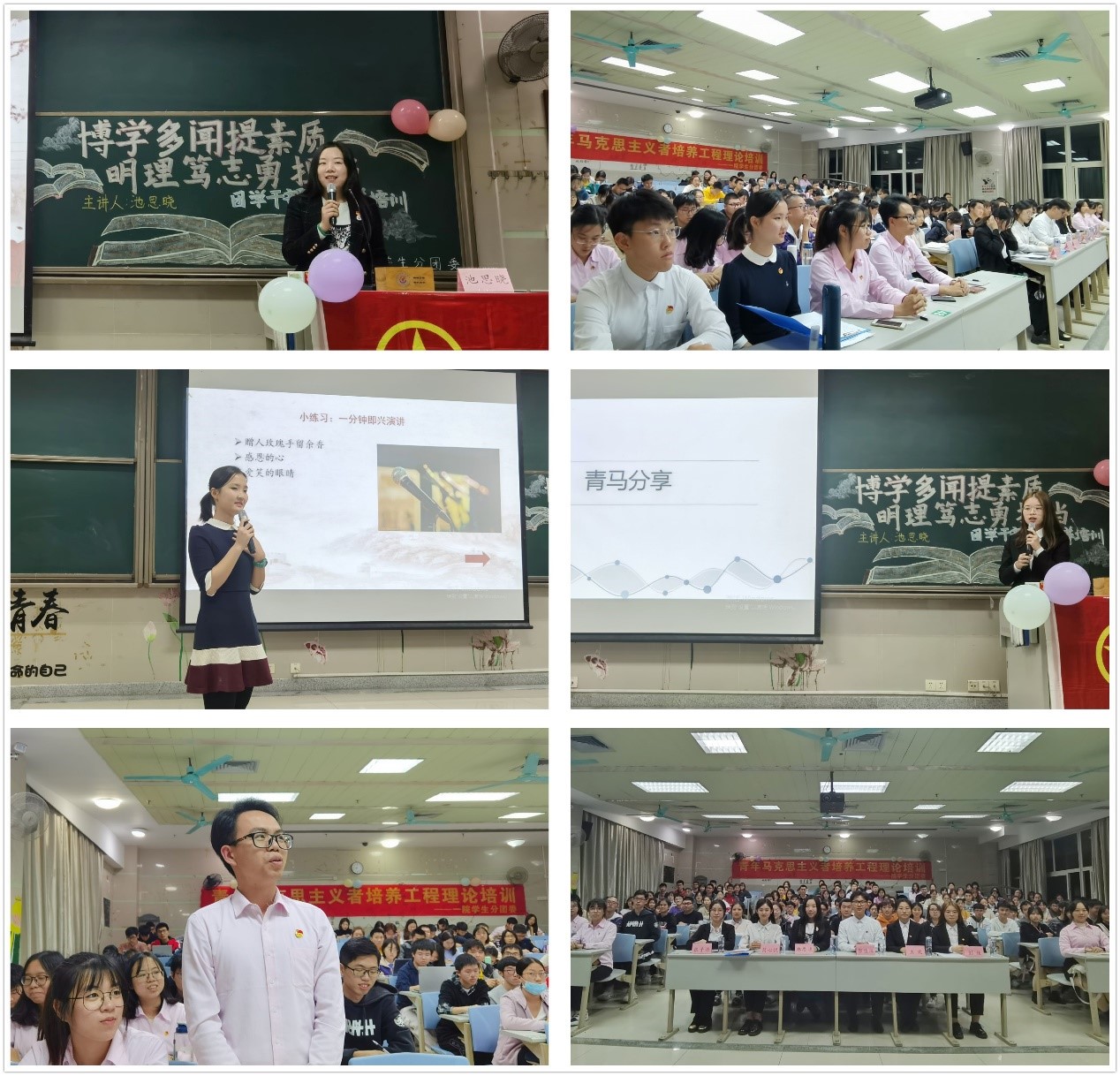 正式授课前,池老师通过简单的提问互动,检验学员们对前三讲的学习效果,并勉励学员们要将前三讲所学融入工作实践。课上,池老师首先带领我们学习了全国学联二十七大报告和习总书记贺信,并通过三个有趣的小视频深入浅出地为大家讲解了“这五年被点赞的中国名片”、“十九届五中全会精神”和“十四五未来规划蓝图”等内容,并通过问答互动的方式使同学们对两个重要会议的精神有了更深刻的领悟。接着,池老师邀请部分学员分享自己在团学工作中的定位,同大家一起探讨指出,“学生干部首先是学生而不是“干部”,是一个服务者而不是“领导者”,是榜样,是广大学生的代言人。”随后,池老师还从“思想政治素质”、“智能素质”、“健康素质”等方面与大家一起探讨了团学干部应具备的核心素质。在讲授言语表达能力的部分时,池老师还邀请学员进行 “一分钟即兴演讲”的体验,多名学员积极参与,并纷纷表示:“想要具备良好的沟通表达能力,不仅需要日常一点一滴的知识积累,常态化的语言组织练习,还需要有意识地加强临场应变训练等。”池老师的殷殷教诲进一步强化了青马学员们的政治思想,坚定了他们勤奋学习踏实工作的信念。紧接着,老师邀请优秀团学干部上台进行经验分享。学生分团委实践部负责人张子清为我们带来了组织三下乡表彰大会活动的经验,学生会文娱部负责人彭佳也与我们分享了筹备2020学年一院迎新晚会的历程。最后,在学员们热烈的掌声中,我院青马工程培训班第四讲就此结课。会后,很多学员表示不虚此行,在本节课学到不仅学到了相关的理论知识,还收获了将理论运用于实践的经验。