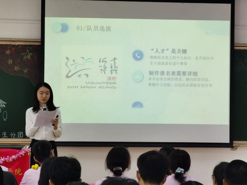 会议正式开始,我院全国三下乡“优秀团队”——福铃志愿者团队队长李泳瑜上台分享本团队队员选拔、队伍管理的经验以及三下乡途中的奇闻趣事,令观众更加深刻地认识到作为队伍负责人的责任与担当,同时也使大家对三下乡有了更加美好的向往。随后,李泳瑜同学还针对同学们便利贴上的问题进行了细致的解答。接着,现场还进行了“看图猜词语”的游戏环节,同学们积极抢答。“风起云涌,信誓旦旦,子孙满堂”,猜一词语,“是风信子呀!”一位同学大声回答道。通过游戏环节,主持人还向同学们介绍了我院为三下乡活动取名“风信子”的深刻内涵,如同风信子的花语“只要点燃生命之火,便可同享丰富人生。”,我院多年来开展“风信子”三下乡活动,正是希望同学们能够通过暑期三下乡活动,积极奉献自己、服务他人,在奉献与服务中收获精彩的人生。再接着,一院学生分团委实践部负责人彭云浩同学详细讲解了暑期社会实践活动开始前的撰写标书、策划书的要求以及注意事项,带领同学们熟悉三下乡的前期准备工作等,随后彭云浩还与现场同学们针对开展三下乡活动进行了交流,为同学们答疑解惑。最后,与会人员合影留念。至此,2021年“风信子”交流会圆满结束。