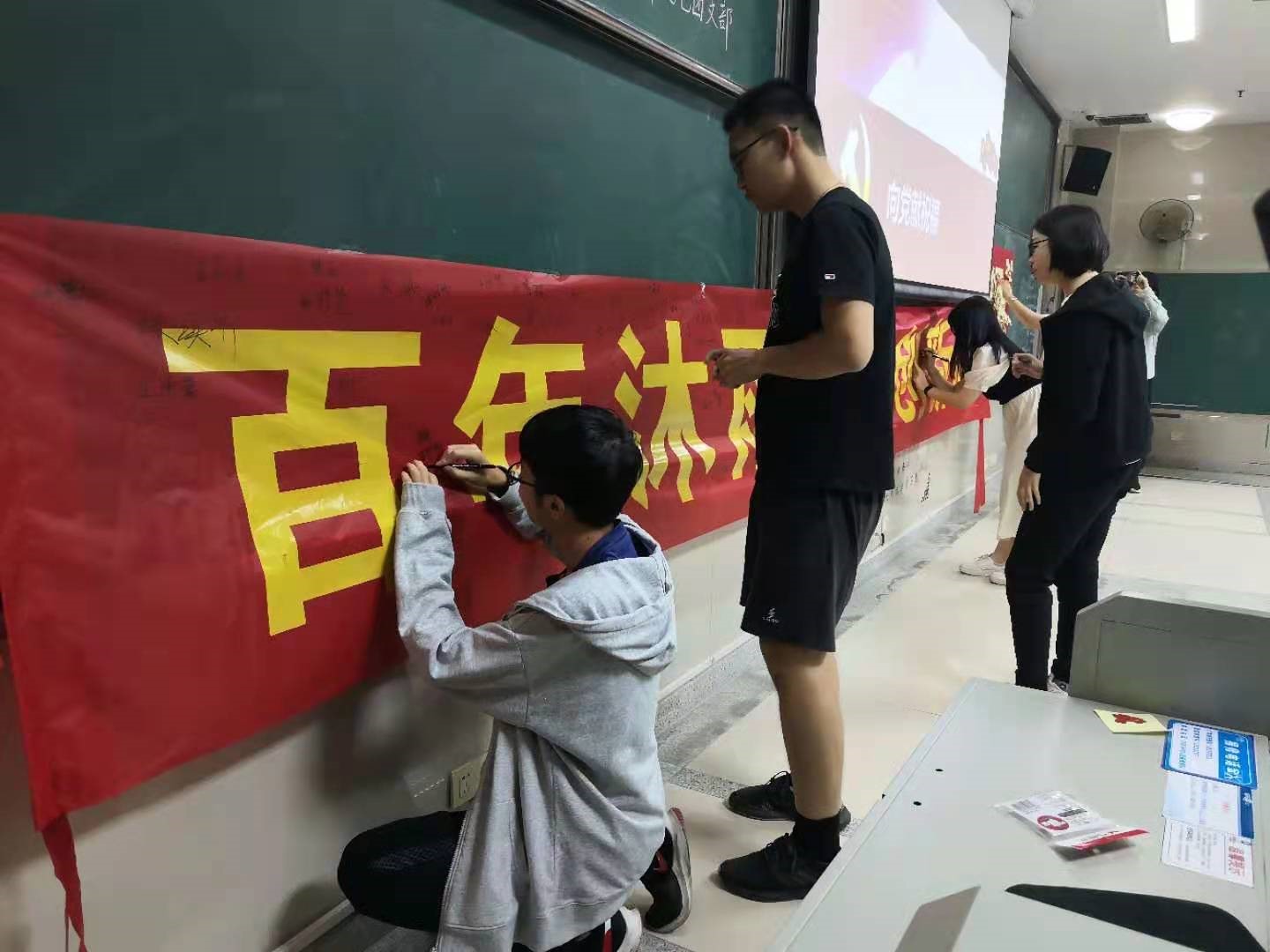 同学们在横幅上签名