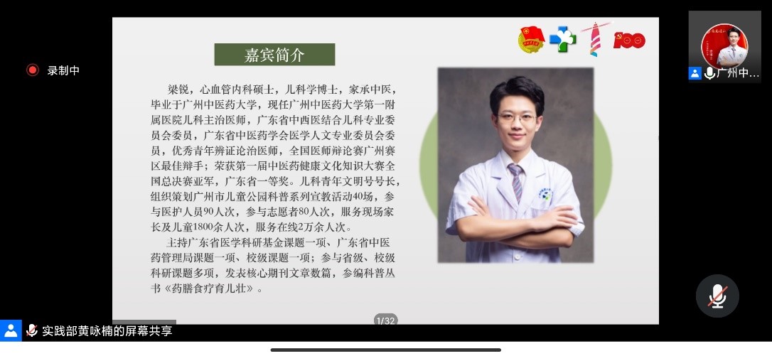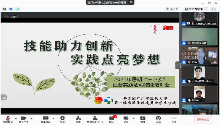 【一院讯】2021年6月18日晚,第一临床医学院“技能助力创新,实践点亮梦想”2021年暑期三下乡社会实践活动技能培训会在腾讯会议平台如期举行。我校公共卫生与管理学院应用心理学系主任、中医心理学博士生导师黄时华教授、我校第一附属医院儿科主治医师梁锐博士、一院学生分团委书记池思晓老师、以及一院240名三下乡队伍代表参加了本次线上培训会。本次培训会旨在通过对三下乡调研报告的选题、研究设计及报告撰写等方面进行培训,为我院学子顺利开展暑期三下乡社会调研活动奠定良好的基础。