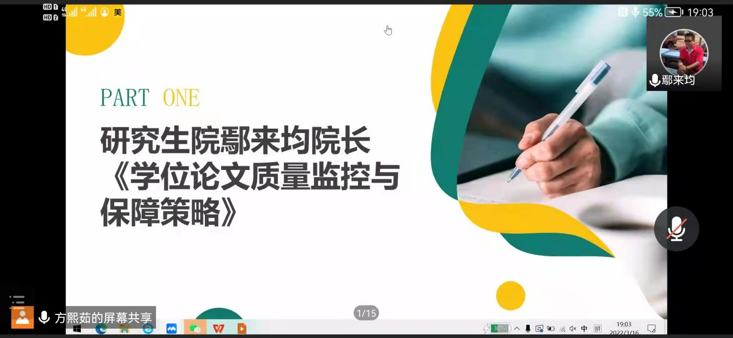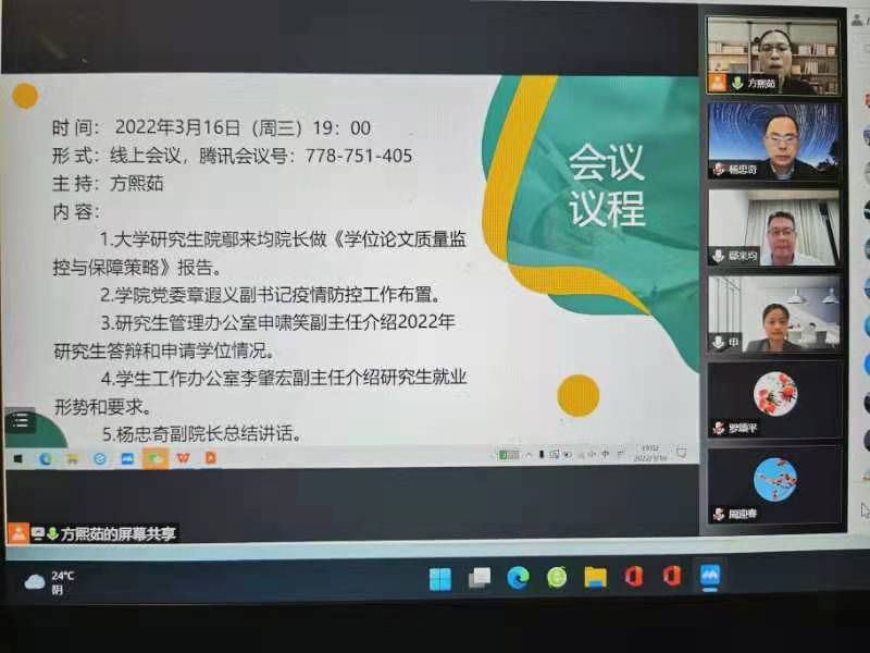 会议分四个议程,首先由大学研究生院鄢来均院长向全院导师进行《学位论文质量监控及保障策略》的专题讲座;接着由章遐义副书记对当下疫情防控工作向全院导师提出要求,切实加强对研究生在疫情防控常态化下的日常管理;随后,研究生管理办公室申啸笑副主任向全院导师介绍了2022年研究生毕业和申请学位的相关情况;然后,学生工作办公室李肇宏副主任传达了上级关于2022年毕业研究生的文件精神和要求,并向导师介绍我院就业工作方案。最后,学院杨忠奇副院长与全体导师一起学习了教育部印发的《研究生导师指导行为准则》,要求全体导师要切实强化导师第一责任人的职责,高度重视并落实今晚培训的内容。