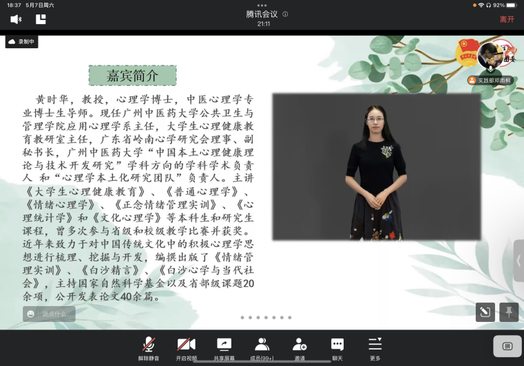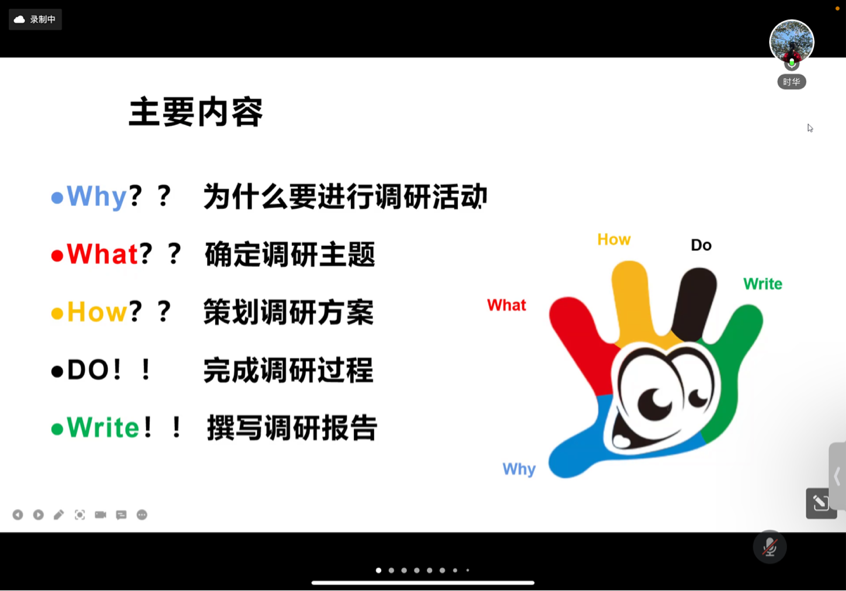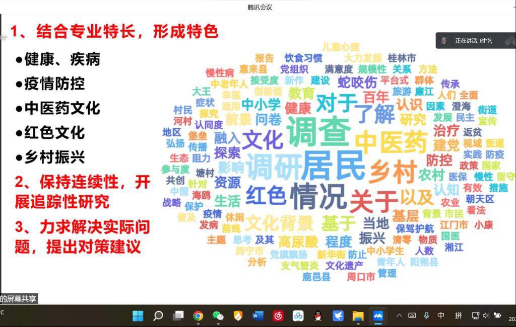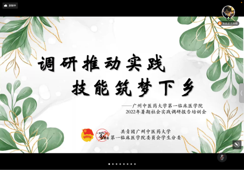 【一院讯】2022年5月7日晚,广州中医药大学第一临床医学院“调研推动实践,技能筑梦下乡”2022年暑期社会实践活动调研报告培训会在腾讯会议平台如期举行。为了帮助我院学子系统地学习调研报告形成的步骤,提高暑期社会实践活动调研报告质量,我们有幸邀请到我校公共卫生与管理学院应用心理学系主任、中医心理学博士生导师黄时华老师,针对暑期社会实践活动的调研选题、问卷设计以及报告撰写为同学们进行培训,我院两百余名“三下乡”队伍代表参加了本次线上培训会。