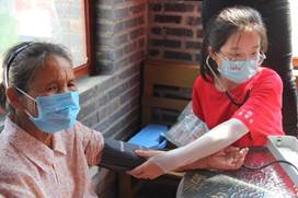 志愿者为村民赠药 志愿者为村民量血压