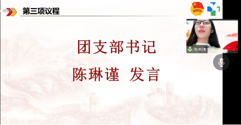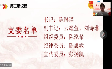 会议第三部分,临时团支部委员发表就职演讲。各位委员纷纷结合自己的工作性质与职能,向与会人员汇报他们对支部成立以后的工作规划与展望。团支部书记陈琳谨表示,自己将与学生会骨干一起,以同学的发展需求为中心,传承并创新发展我院特色品牌活动,切实帮助青年学生提升自我,服务青年学生成长成才。团支部副书记云耀萱、刘诗琳则在各自的发言中明确自己将鼓励带动团支部成员用科学理论武装自身,并通过开展多样化的团日活动,丰富同学们的课余生活,塑造一院青年的良好形象。组织委员陈泓希基于自己对组织事务的见解,向与会人员介绍了他在加强团支部组织建设方面的工作思路。纪律委员陈思敏在演讲中展现了她对同伴教育职能的重视,她将会协助支部制定学习计划,对党国历史等内容开展理论学习。宣传委员彭扬凯从对内宣传发动,对外形象塑造两项重要任务出发,展示他对于提升一院学生会宣传工作质量的计划。各位委员激情澎湃的话语,使与会人员充分感受到他们对一院学生会强烈的责任感和归属感,也对团支部未来的发展充满期待。