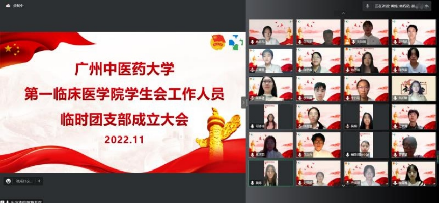 为进一步落实《关于改革创新高校共青团工作切实增强思想政治引领实效的若干措施》相关要求,深化学生会组织改革、加强团组织对学生会的指导作用,促进学生团员在基层一线发挥模范带头作用,第一临床医学院(以下简称“一院”)学生会积极响应号召,筹建学生会功能型团支部,并于11月26日19:00在腾讯会议线上正式召开一院学生会工作人员临时团支部成立大会。一院学工办副主任李肇宏,一院学生团委书记池思晓,一院指导老师黄婷、何诗诗、陈小波,一院学生团委代表,以及一院学生会工作人员代表共30人出席了本次大会。
