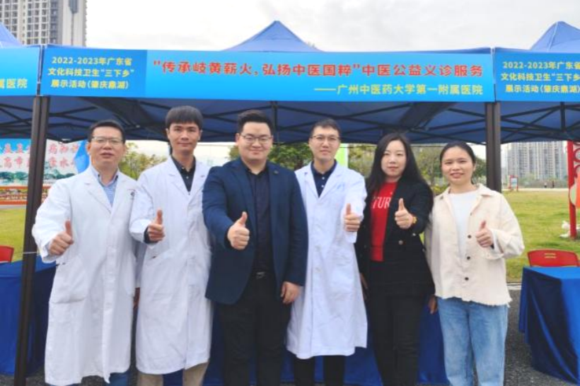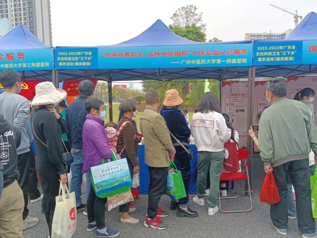 2023年3月14日,由省委宣传部、省文明办、省科协等省直单位联合肇庆市人民政府,在肇庆市鼎湖区举办2022-2023年广东省文化科技卫生"三下乡"展示活动。广州中医药大学第一附属医院受邀在此次活动中开展中医公益义诊服务和中医药文化健康科普工作,教学党总支以“传承岐黄薪火 弘扬中医国粹”为主题,充分利用多年来暑期社会实践“三下乡”的工作经验,积极开展本次“三下乡”任务,现场约有2000人参与了这场文化科技卫生盛宴。