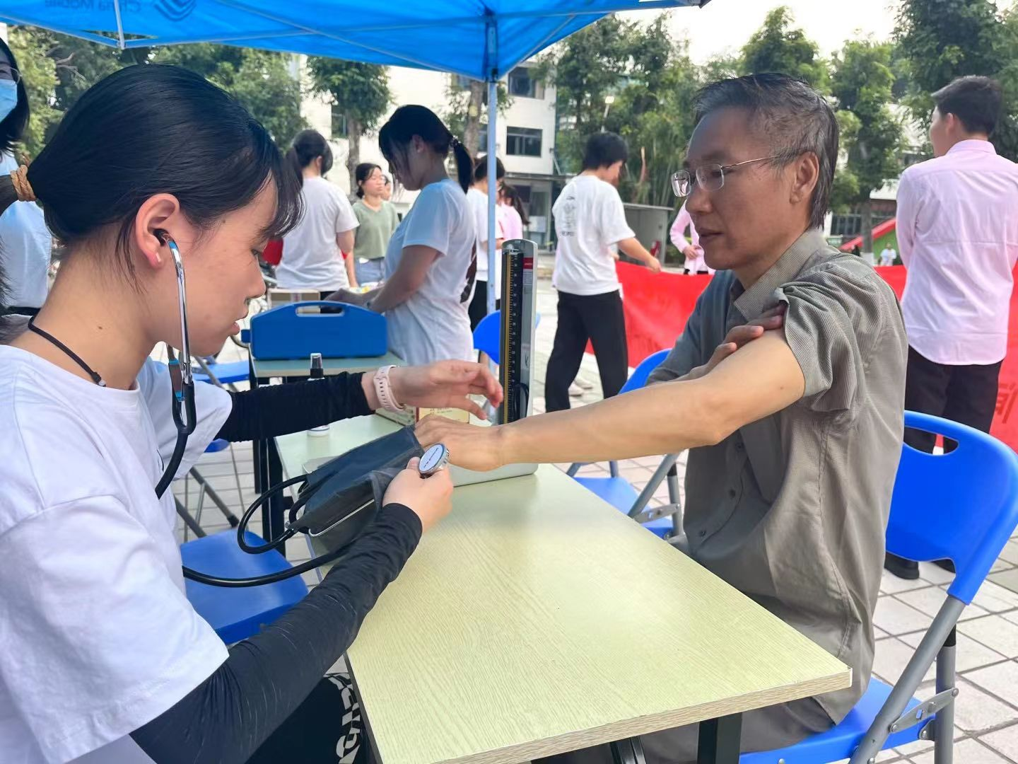 (志愿者为同学和教职工量血压、推拿)