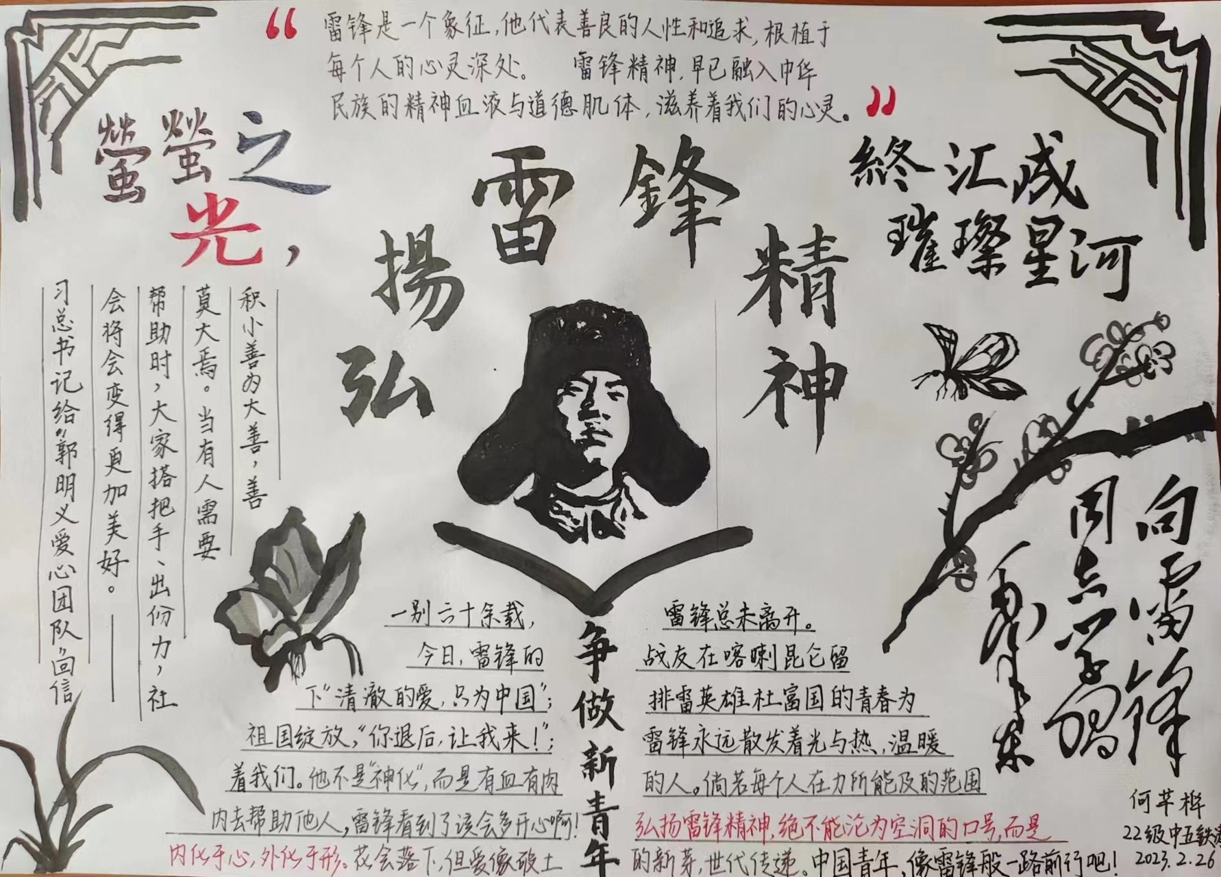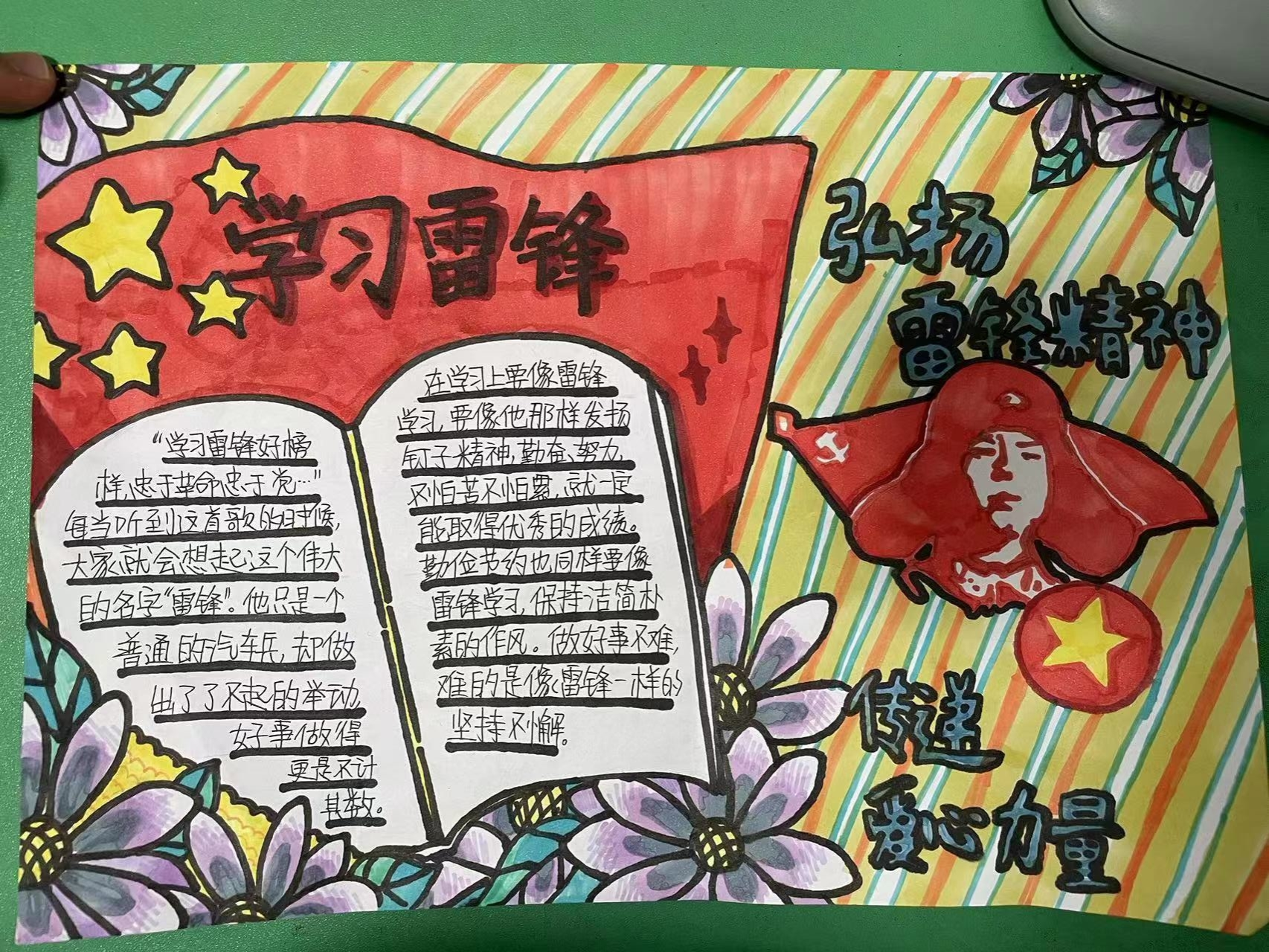 学习雷锋好榜样,传递青春正能量。在以“雷锋在我身边”、“学习雷锋精神”为主题的手抄报绘制活动中,同学们妙笔绘雷锋,翰墨书奉献,在作品中呈现了雷锋精神的浪漫。一幅幅绘画,不仅是雷锋精神的见证,更是滋养奉献血脉的“甘泉”。