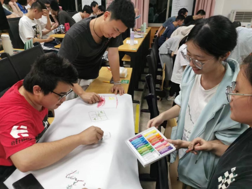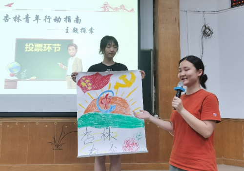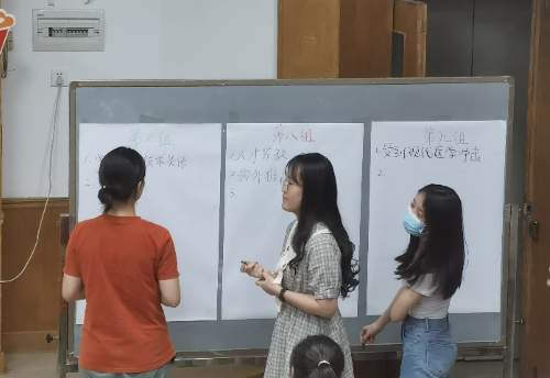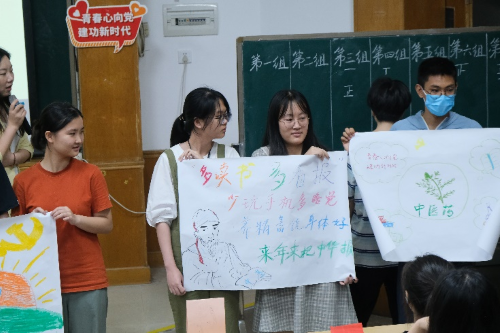 在第三部分“当代杏林青年肩负发展中医药事业的时代使命”这一环节中,池思晓老师邀请同学们以小组为单位围绕“当代青年如何促进中医药传承创新发展”这一话题进行讨论,并将讨论成果创作“杏林青年行动指南”。各小组同学边讨论边纷纷拿起彩笔画起来、写起来,只见一张张空白的图画纸在同学们手中变成一幅幅内涵丰富、色彩斑斓的画作。展示环节中,各小组代表的精彩解说也彰显出同学们对于自身肩负发展中医药事业时代使命的深刻思考与感悟。