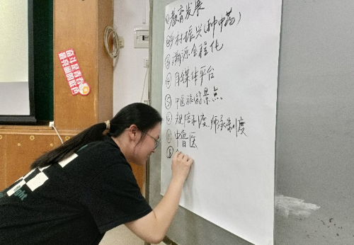 第二部分,池老师围绕“新时代背景下中医药发展的机遇与挑战”这个话题,组织同学们以“头脑风暴+接龙大PK”的形式,进行了小组主题讨论、组间接龙大PK作答等环节。“中医人才培养周期长、难度大”“中药品质的监管有待完善”“后疫情时代中医药的国内、国际认可度显著提升”……小组代表们纷纷在小组的答题纸上写下了许多当代中医药发展所面临的机遇与挑战,比赛现场讨论氛围热烈,同学们还几度围绕作答的内容进行了辩论。