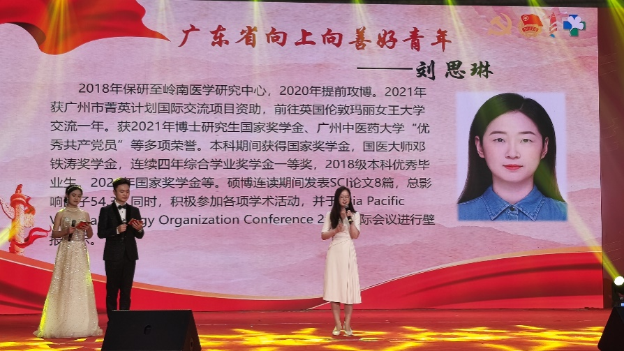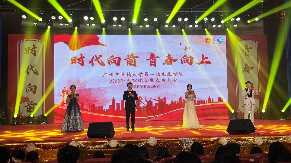 5月14日晚19时,广州中医药大学第一临床医学院2023年“时代向前,青春向上”五四晚会暨表彰大会在我校大学城校区学生活动中心大会堂隆重举行。学校团委副书记王烁,学院党委副书记章遐义,学院党办负责人、团委书记叶升鑑,一附院人事处处长丘惠燕,学院教学处处长方熙茹,一附院医院办公室负责人钟天送,学院学工办副主任李肇宏,学生团委书记池思晓,副处级辅导员刘文红、一附院脑病科医师、研究生班主任林长峰,学院学工办武夏林、南海伦、陈小波、何诗诗、彭力阳等领导老师莅临晚会现场,一院大学城校区各班级学生积极参与了本次晚会。