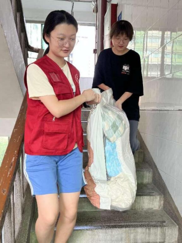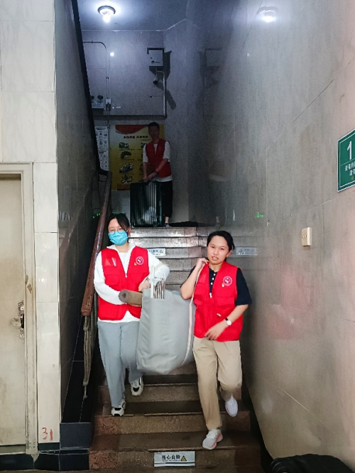 清晨6:30,宿舍区仍是一片寂静,党员与入党积极分子们已穿上志愿者服待命。鲜红的马甲宛若初升的旭日,闪耀着灿烂的光芒。大巴车陆续进校,天气逐渐炎热,志愿者们或拎着装满被子的袋子,或扛着沉重的行李箱,穿梭在宿舍的过道,奔跑在狭窄的楼梯上。“同学,你还有行李吗?我可以帮忙搬”,“这个行李箱比较重,我来拿吧”。豆大的汗珠从志愿者们潮红的脸上滑落,没入从浅色变为深色的衣服,甚至浸透了红马甲,他们只是随手抹去汗,又投入了忙碌中。