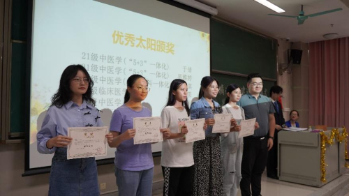 活动在参会人员观看2023年精诚学风建设月和向日葵学术传承活动的回顾视频中开始。第一临床医学院学生工作办公室陈小波老师为本次精诚学风建设月和向日葵学术传承活动作总结报告。之后是优秀太阳的颁奖环节,经过一院学术部的认真遴选,评选出六位优秀太阳,他们分别是:21级中医学(“5+3”一体化)于倩、21级中医学(“5+3”一体化) 吴雅婷、21级中医学(本硕儿科一体化) 郑锦琪、21级临床医学李霈霁、21级中医学陈雨娴、21级中医学黄怡菲。李霈霁作为优秀太阳代表进行发言,她介绍了她在担任太阳期间与小花熟悉并进行个性化培养的经验,重点强调了解个人特点的重要性,并建议今后想成为太阳的同学多尝试从小花的需求与强项入手,在生活和学习中帮助小花。