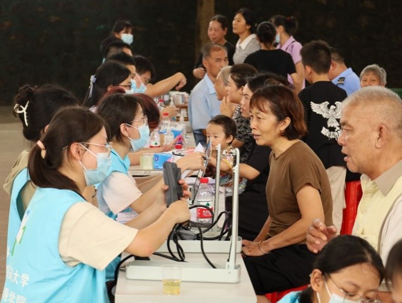 与此同时,“福铃”志愿者服务队的医学生志愿者们也不甘示弱,以专业所学辅助专家们为民众提供量血压、贴耳穴、推拿按摩、中医体质辨识等中医特色基础医疗服务,志愿者们娴熟的手法、暖心的关怀给了村民们优质的服务体验。师生们携手同心为当地居民的健康保驾护航,得到了村民们的高度好评。