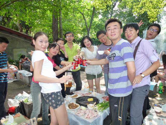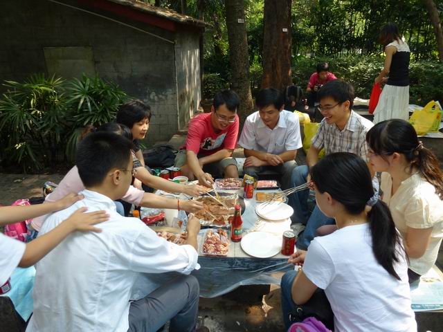 来到晓港公园,只见人声熙攘,人头攒动,有游园赏景的,有跳交谊舞的,有打拳健身的,有游船划水的,一派热闹景象。我们穿林越草,沿着蜿蜒林荫斜径,转过楼台亭榭,终于来到了公园专设的烧烤场。尽管一路奔波大家都已稍有疲态,但到了烧烤营地后,马上精神倍增,个个摩拳擦掌,跃跃欲试,准备大显身手。一早上就提前来到的班长张昇、沈晓明、李晓荣、钟萍以及吴海滨、于淼等同学,已经早早地把提前买好的烧烤所需用品摆开,租好了场地拉开了“战场”。大家上前一看,有饮料、水果、五花肉片、牛肉片、馒头、鸡翅、红薯、土豆、茄子、青菜及各种酱料,真是考虑周到,应有尽有!看来,班委们为了广大同学能够在今天吃好玩好,真是下了大力气,提前做了诸多默默无闻的工作。同学们纷纷向他们的无私奉献精神表示感谢。