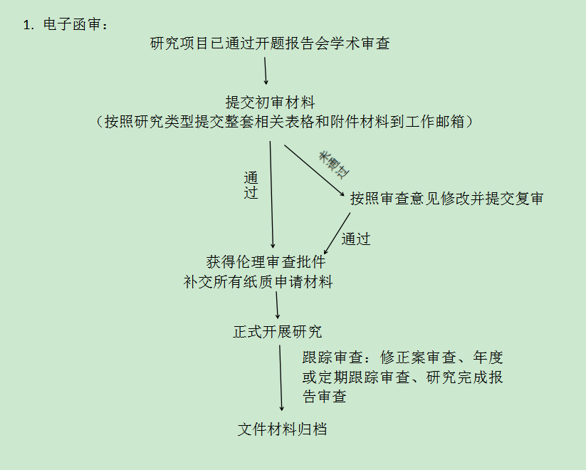 1. 我院所有涉及人的生物医学研究项目,研究者在进行研究之前均需呈送伦理审查,得到伦理委员会的批准后方可实施;