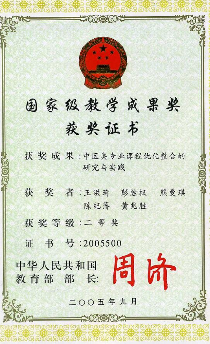 2005 | 中医类专业课程优化整合的研究与实验 | 教育部、广东省教育厅、全国中医药高等教育教学学会 | 第五届高等教育教学成果国家二等奖、广东省高等教育教学成果一等奖;全国中医药高等教育教学研究优秀成果奖 |