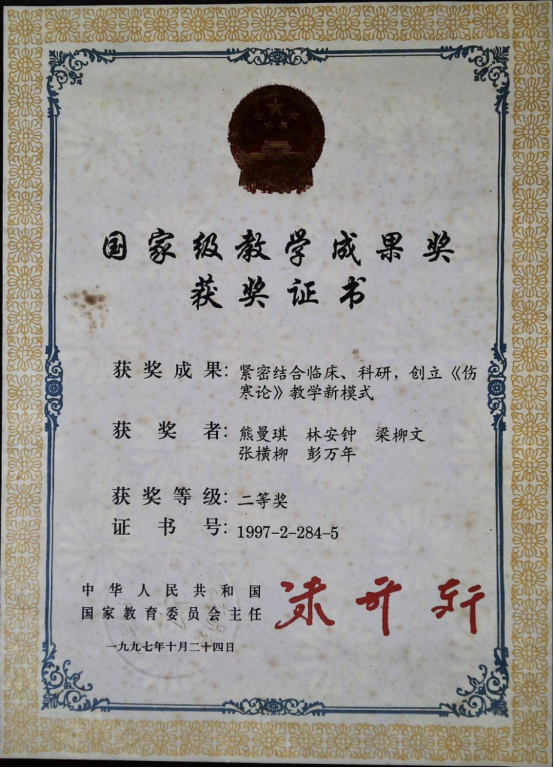 “紧密结合临床科研,创立《伤寒论》教学新模式”1997年荣获国家级教学成果二等奖、省级教学成果一等奖
